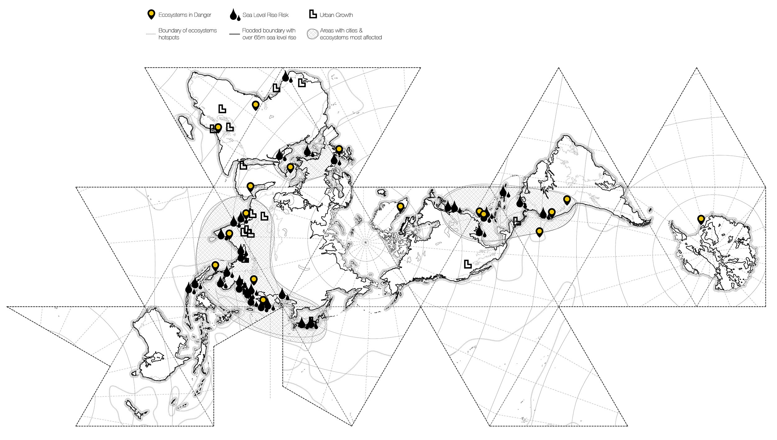 The project stems from an analysis of the world’s population growth. A rapid growth is expected for the first half of the 21st century, propelled specially, by the developing countries (from 7.2 billion to 9.6 billion people estimated in UN´s ”World Population Prospects” report). The direct consequence observed was the partial destruction of natural ecosystems, where cities stand all around the world, although many of these ecosystems are of use for some major challenges that our society will face – sea level rise and scarcity of resources. Part of this damage is produced by today´s building systems, which do not take into account the natural environment where they are built. Moreover, the actual built environment is not designed to absorb the sea level rise.
